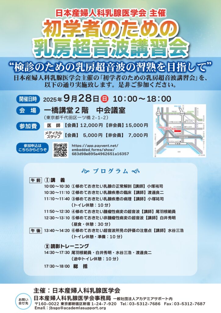 この度、昨年大好評を頂きました、日本産婦人科乳腺医学会主催「初学者のための乳房超音波講習会」を本年も以下の通り開催致しますことをご案内申し上げます。